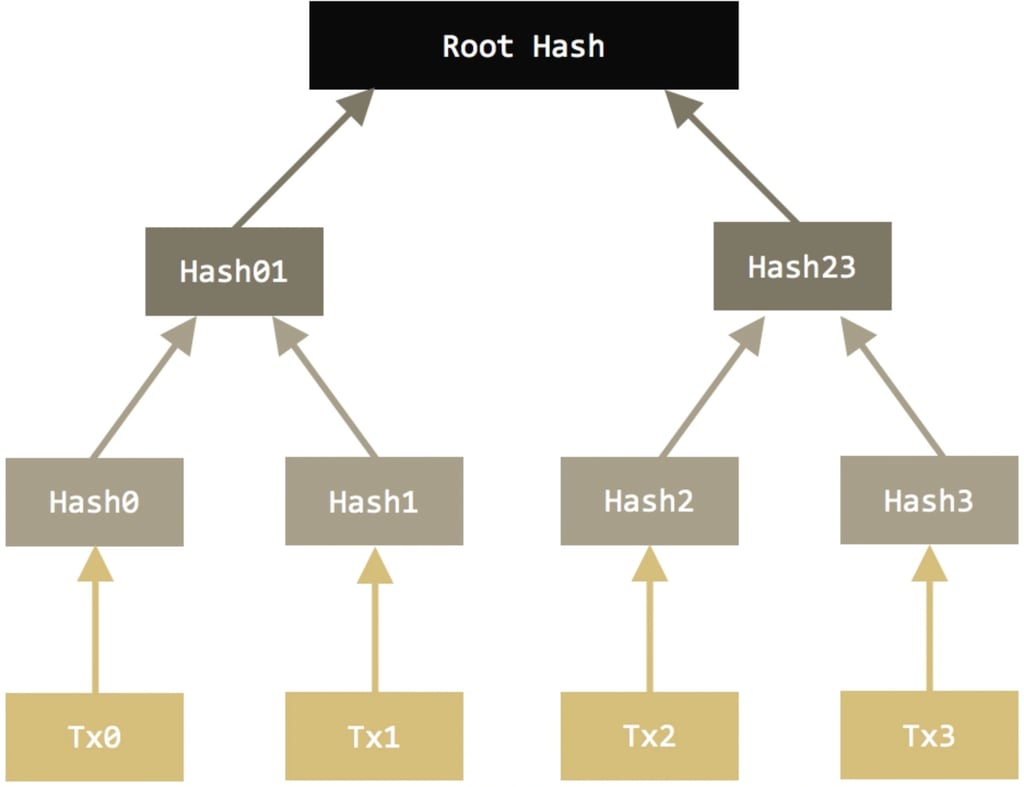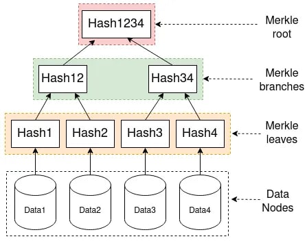 This gives an easy way to verify through a series of branches as opposed to checking every piece of data and resulting hash. The scaling is logarithmic, so if there are 1024 pieces of data, in order to check the Merkle root consists of one specific piece of data, there would be 10 levels within the tree (2^10 = 1024), so we would only need to check 10 sets of hashes in order to determine if our data is in fact apart of the Merkle Root and confirm the validity, which is much more efficient than if we were to just hash all the data together, then all of the 1024 data inputs would need to be checked