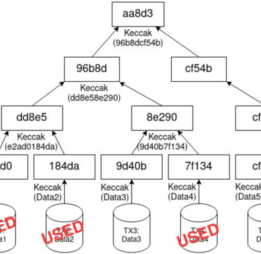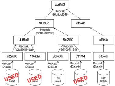 On the left, we have a merkle tree of an example of transactions within a bitcoin block, and the coalescing of the hashes down into a root hash function. On the right, some of the used transaction outputs can be pruned off the tree in order to save blockspace