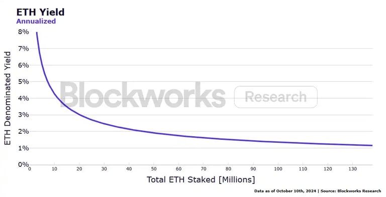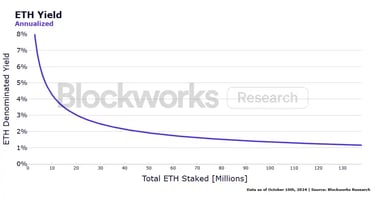 Currently, the staking yield on the Ethereum network is 2.23%. This amount of ETH distributed to stakers is not set in stone and is able to fluctuate depending on the market conditions to allow the network to run smoothly and efficiently. As we can see the more ETH staked, the less the staking yield, which creates natural market pressure for ETH holders to stake when there are few stakers due to high yield. Due to transaction fees within the network, the amount paid to stakers is more than covered by the fees generated by transactions which results in Ether becoming a scarcely depreciating asset which creates upwards momentum within the price, attracting investors and bringing more stake to secure the network